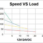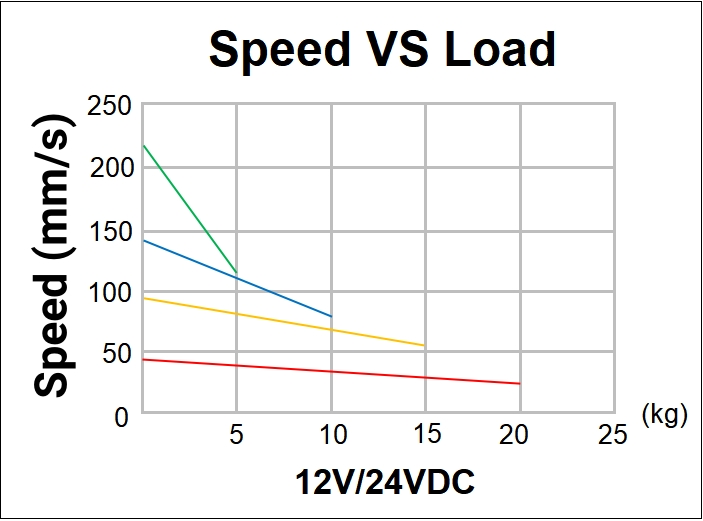 Speed vs. Load (12V/24VDC): Speed decreases linearly with increasing load, maintaining predictable operation under different force requirements.
