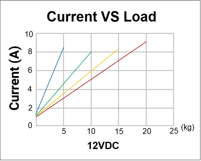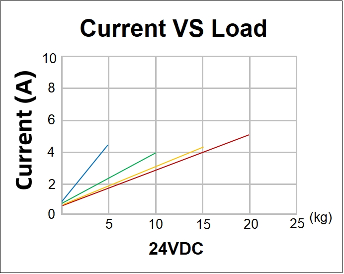 Current vs. Load (12V/24VDC): Current draw increases proportionally with load, providing clear operational feedback for system monitoring and control.